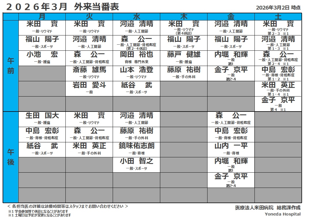 「米田病院」と「よねだ整形リハビリクリニック」の2施設がございますが、はじめての方は「米田病院」で診察いたします。